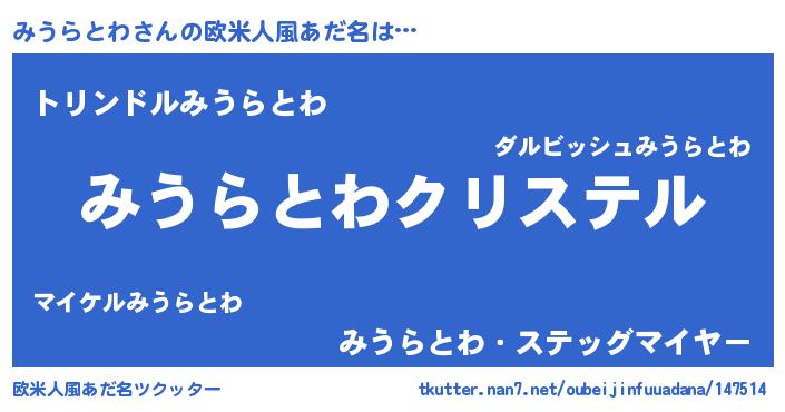 | 男性向けラノベタイトル風あだ名 | 『やはりみうらとわの青春ラブコメはまちがっている 』 |