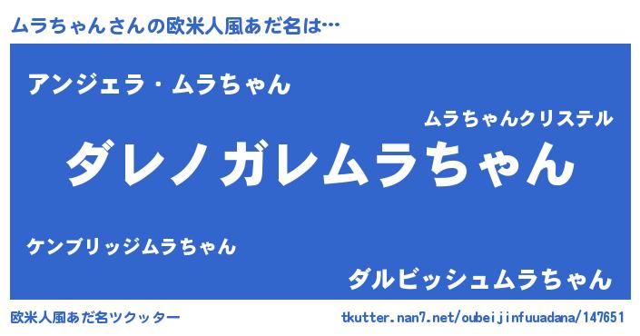 | 男性向けラノベタイトル風あだ名 | 『この素晴らしい世界にムラちゃんを!』 |