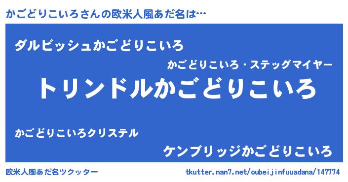 | 男性向けラノベタイトル風あだ名 | 『かごどりこいろ~年齢イコール彼女いない歴の魔法使い~』 |