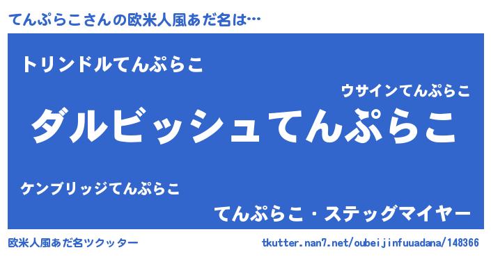 | 男性向けラノベタイトル風あだ名 | 『てんぷらこという概念が存在しない退屈な世界 』 |