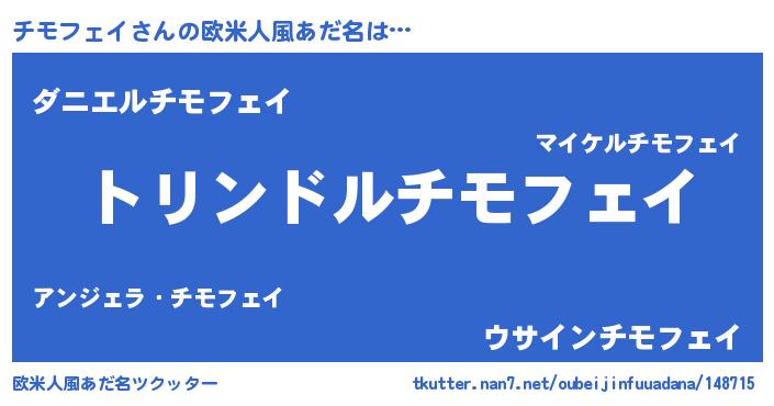 | 男性向けラノベタイトル風あだ名 | 『チモフェイ~年齢イコール彼女いない歴の魔法使い~』 |