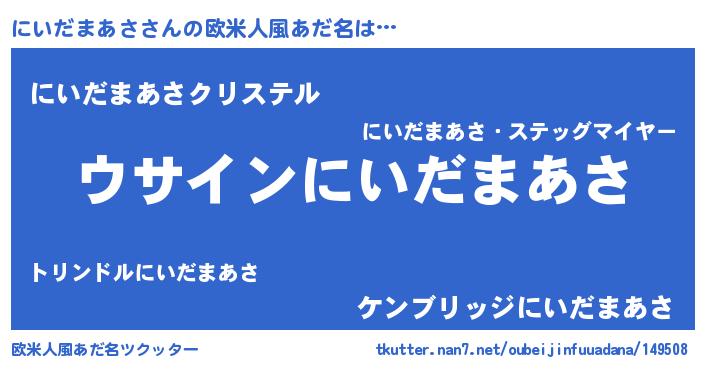 | 男性向けラノベタイトル風あだ名 | 『にいだまあさの嫁は女の子じゃないと思った?』 |