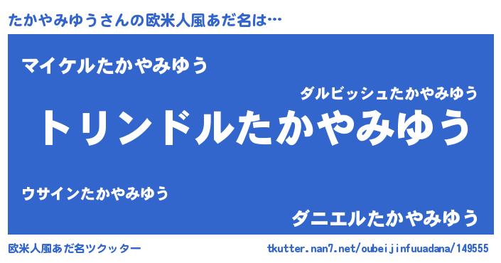 | 男性向けラノベタイトル風あだ名 | 『たかやみゆう~年齢イコール彼女いない歴の魔法使い~』 |