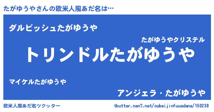 | 男性向けラノベタイトル風あだ名 | 『たがゆうや~年齢イコール彼女いない歴の魔法使い~』 |