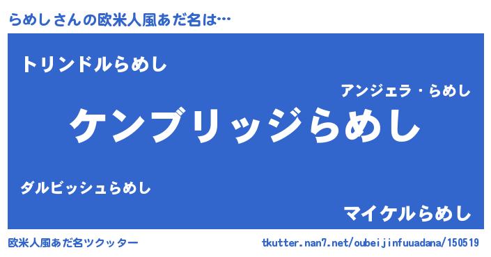| 男性向けラノベタイトル風あだ名 | 『Re:らめしから始める異世界生活』 |