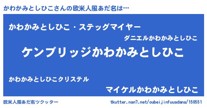 | 男性向けラノベタイトル風あだ名 | 『Re:かわかみとしひこから始める異世界生活』 |