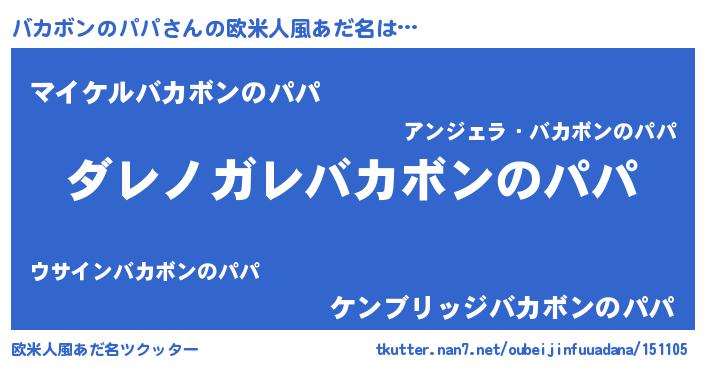 | 女子向けラノベタイトル風あだ名 | 『乙女ゲームの破滅フラグしかない悪役バカボンのパパに転生してしまった…』 |