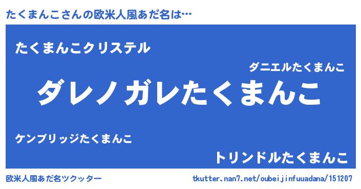 | 男性向けラノベタイトル風あだ名 | 『この素晴らしい世界にたくまんこを!』 |