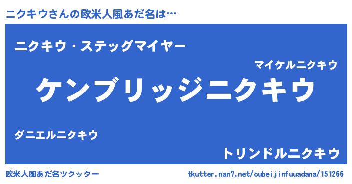 | 男性向けラノベタイトル風あだ名 | 『Re:ニクキウから始める異世界生活』 |