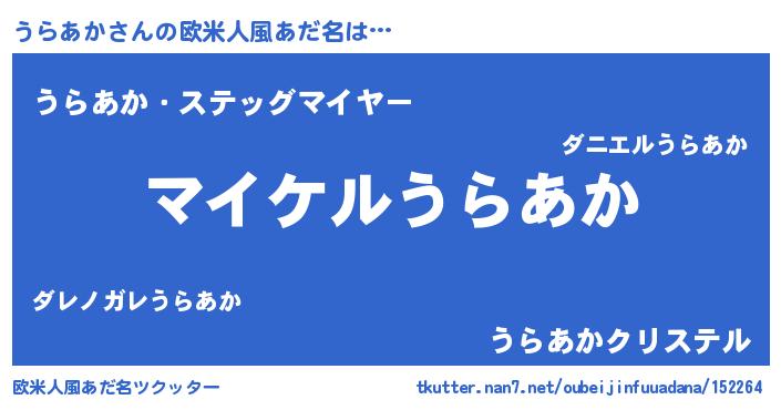 | 男性向けラノベタイトル風あだ名 | 『うらあかの憂鬱』『魔弾の王とうらあか』 |