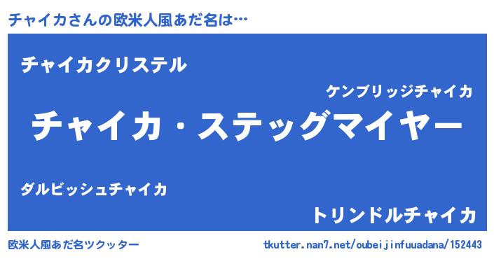 | 男性向けラノベタイトル風あだ名 | 『うちのチャイカが世界を掌握している!』 |