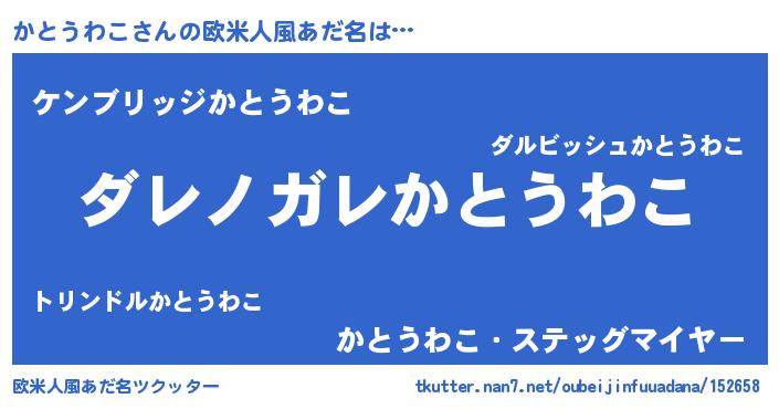 | 男性向けラノベタイトル風あだ名 | 『この素晴らしい世界にかとうわこを!』 |