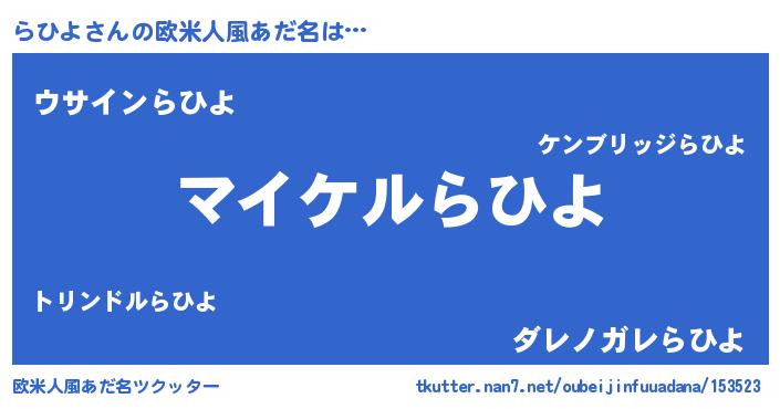 | 男性向けラノベタイトル風あだ名 | 『らひよの憂鬱』『魔弾の王とらひよ』 |