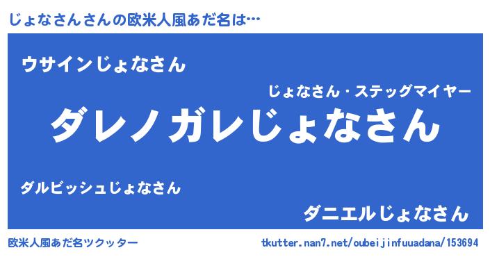 | 男性向けラノベタイトル風あだ名 | 『この素晴らしい世界にじょなさんを!』 |