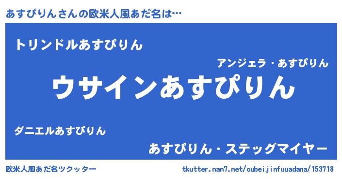 | 男性向けラノベタイトル風あだ名 | 『あすぴりんの嫁は女の子じゃないと思った?』 |