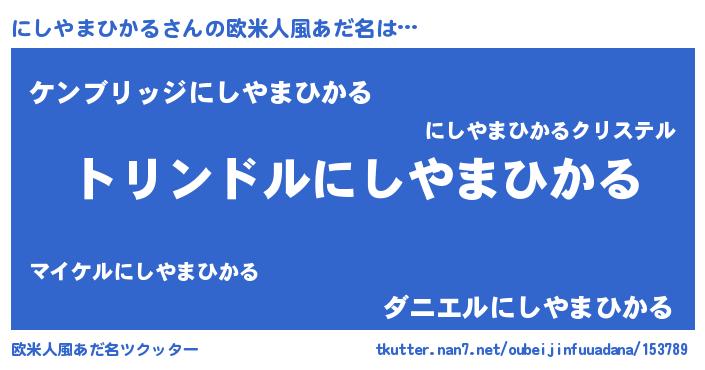 | 男性向けラノベタイトル風あだ名 | 『にしやまひかる~年齢イコール彼女いない歴の魔法使い~』 |