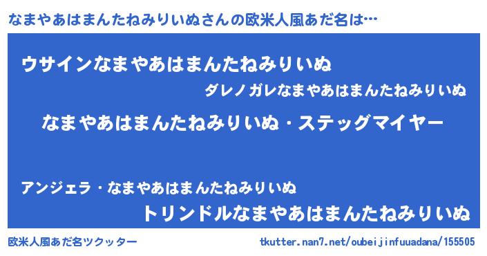 | 男性向けラノベタイトル風あだ名 | 『うちのなまやあはまんたねみりいぬが世界を掌握している!』 |