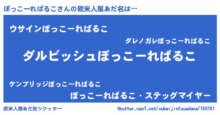 | 男性向けラノベタイトル風あだ名 | 『ぼっこーればるこという概念が存在しない退屈な世界 』 |