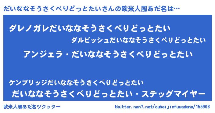 | 意味不明あだ名 | 『住所不定無職だいななそうさくぺりどっとたい(81歳)』 |
