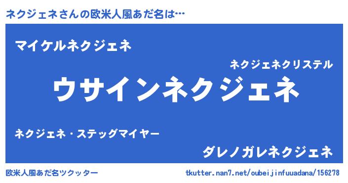 | 男性向けラノベタイトル風あだ名 | 『ネクジェネの嫁は女の子じゃないと思った?』 |