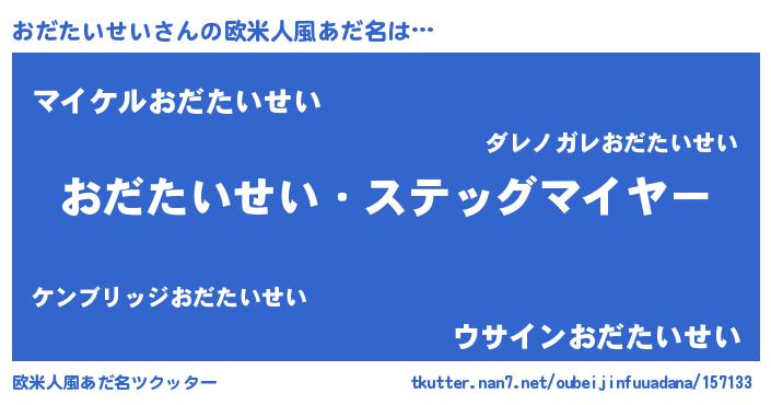 | 男性向けラノベタイトル風あだ名 | 『うちのおだたいせいが世界を掌握している!』 |