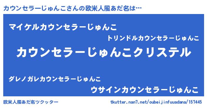 | 女子向けラノベタイトル風あだ名 | 『カウンセラーじゅんこ伯爵の花嫁』 |