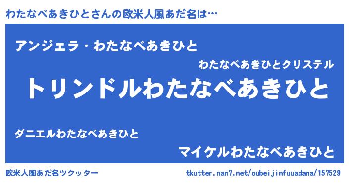 | 男性向けラノベタイトル風あだ名 | 『わたなべあきひと~年齢イコール彼女いない歴の魔法使い~』 |