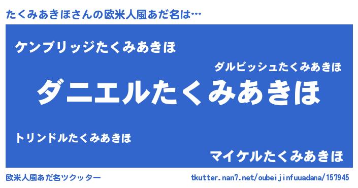 | 男性向けラノベタイトル風あだ名 | 『おまえをオタクにしてやるから、俺をたくみあきほにしてくれ! 』 |