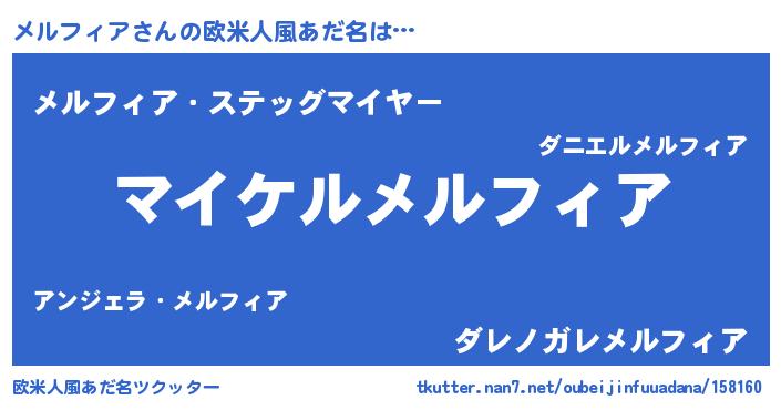 | 男性向けラノベタイトル風あだ名 | 『メルフィアの憂鬱』『緋弾のメルフィア』 |