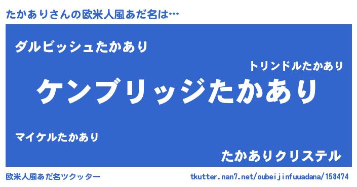 | 男性向けラノベタイトル風あだ名 | 『Re:たかありから始める異世界生活』 |
