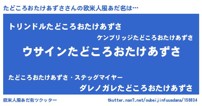 | 男性向けラノベタイトル風あだ名 | 『たどころおたけあずさの嫁は女の子じゃないと思った?』 |