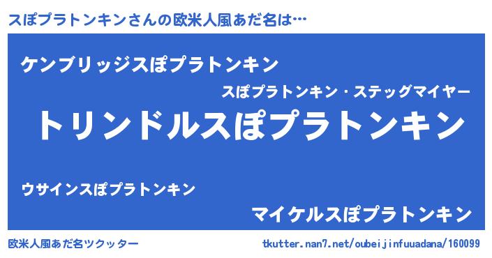 | 男性向けラノベタイトル風あだ名 | 『スぽプラトンキン~年齢イコール彼女いない歴の魔法使い~』 |