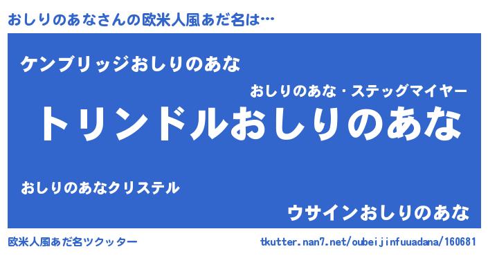 | 男性向けラノベタイトル風あだ名 | 『おしりのあな~年齢イコール彼女いない歴の魔法使い~』 |