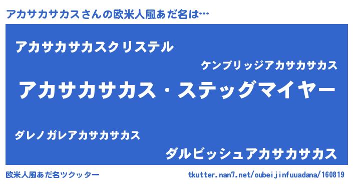 | 男性向けラノベタイトル風あだ名 | 『うちのアカサカサカスが世界を掌握している!』 |