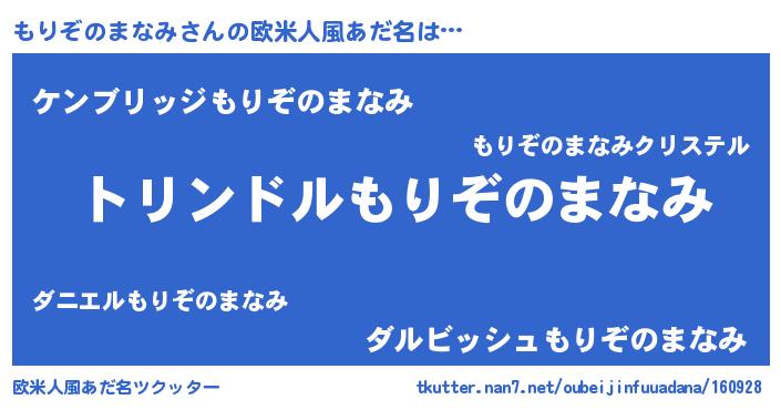 | 男性向けラノベタイトル風あだ名 | 『もりぞのまなみ~年齢イコール彼女いない歴の魔法使い~』 |