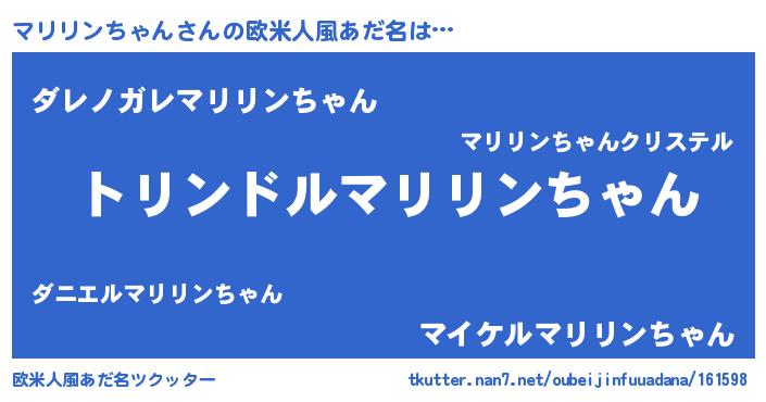 | 男性向けラノベタイトル風あだ名 | 『マリリンちゃん~年齢イコール彼女いない歴の魔法使い~』 |