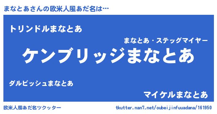 | 男性向けラノベタイトル風あだ名 | 『Re:まなとあから始める異世界生活』 |