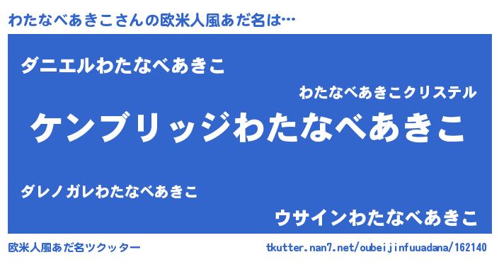 | 男性向けラノベタイトル風あだ名 | 『Re:わたなべあきこから始める異世界生活』 |