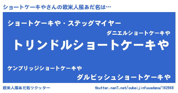 | 男性向けラノベタイトル風あだ名 | 『ショートケーキや~年齢イコール彼女いない歴の魔法使い~』 |