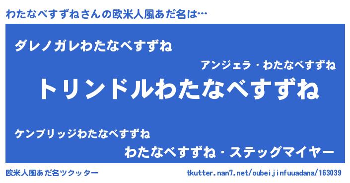 | 男性向けラノベタイトル風あだ名 | 『わたなべすずね~年齢イコール彼女いない歴の魔法使い~』 |