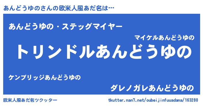 | 女子向けラノベタイトル風あだ名 | 『あんどうゆのの玉の輿計画!』 |