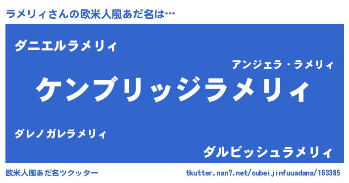 | 男性向けラノベタイトル風あだ名 | 『Re:ラメリィから始める異世界生活』 |