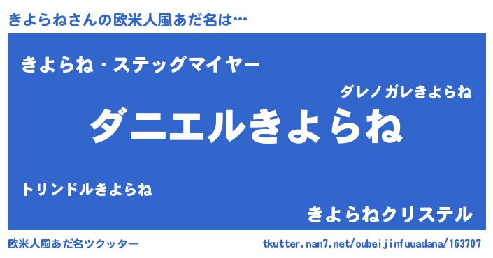 | 男性向けラノベタイトル風あだ名 | 『おまえをオタクにしてやるから、俺をきよらねにしてくれ! 』 |