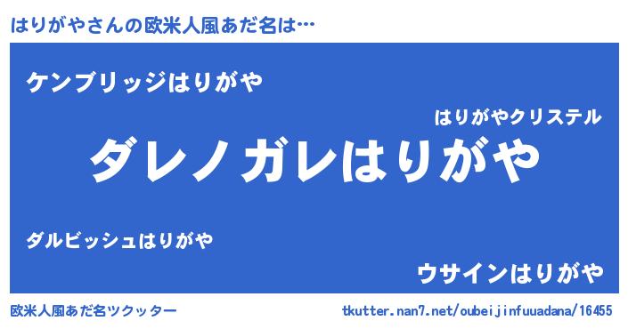 | 男性向けラノベタイトル風あだ名 | 『この素晴らしい世界にはりがやを!』 |