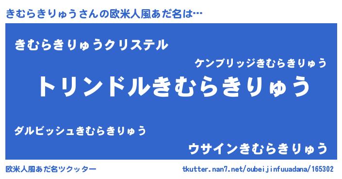 | 男性向けラノベタイトル風あだ名 | 『きむらきりゅう~年齢イコール彼女いない歴の魔法使い~』 |