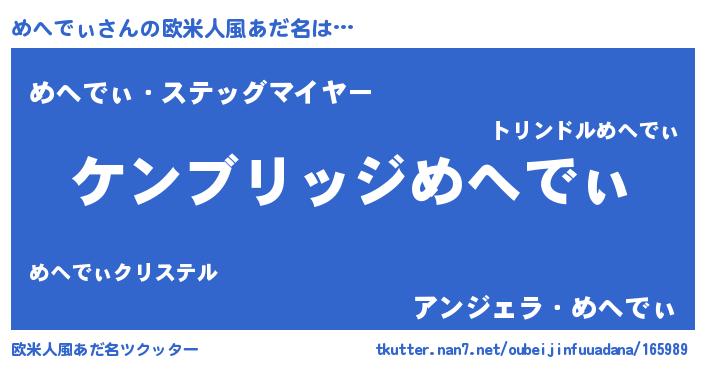 | 男性向けラノベタイトル風あだ名 | 『Re:めへでぃから始める異世界生活』 |