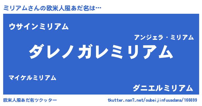 | 男性向けラノベタイトル風あだ名 | 『この素晴らしい世界にミリアムを!』 |