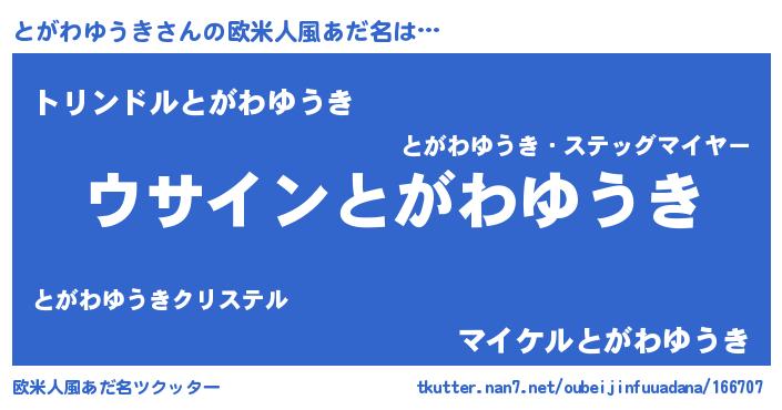 | ポケモン風あだ名 | 『ヒトガワユウキ』『トガキング』 |