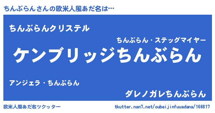 | 男性向けラノベタイトル風あだ名 | 『Re:ちんぶらんから始める異世界生活』 |