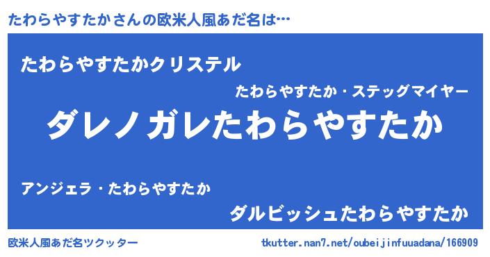 | 男性向けラノベタイトル風あだ名 | 『この素晴らしい世界にたわらやすたかを!』 |